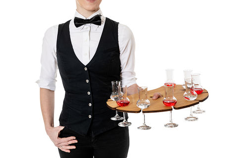 Daraus ist unsere Idee eines einzigartigen Tableau-Konzeptes entstanden, mit dem man im Service völlig neue Wege beschreiten kann – und das im wahrsten Sinne des Wortes. So simpel die Idee, so genial das Ergebnis: ein Brett aus Holz bildet die Basis, die eingefräste Gläserhalterung garantiert ein perfektes Service und dadurch eine unfall-, gläserbruchfreie und rotweinfleckenlose Feier!